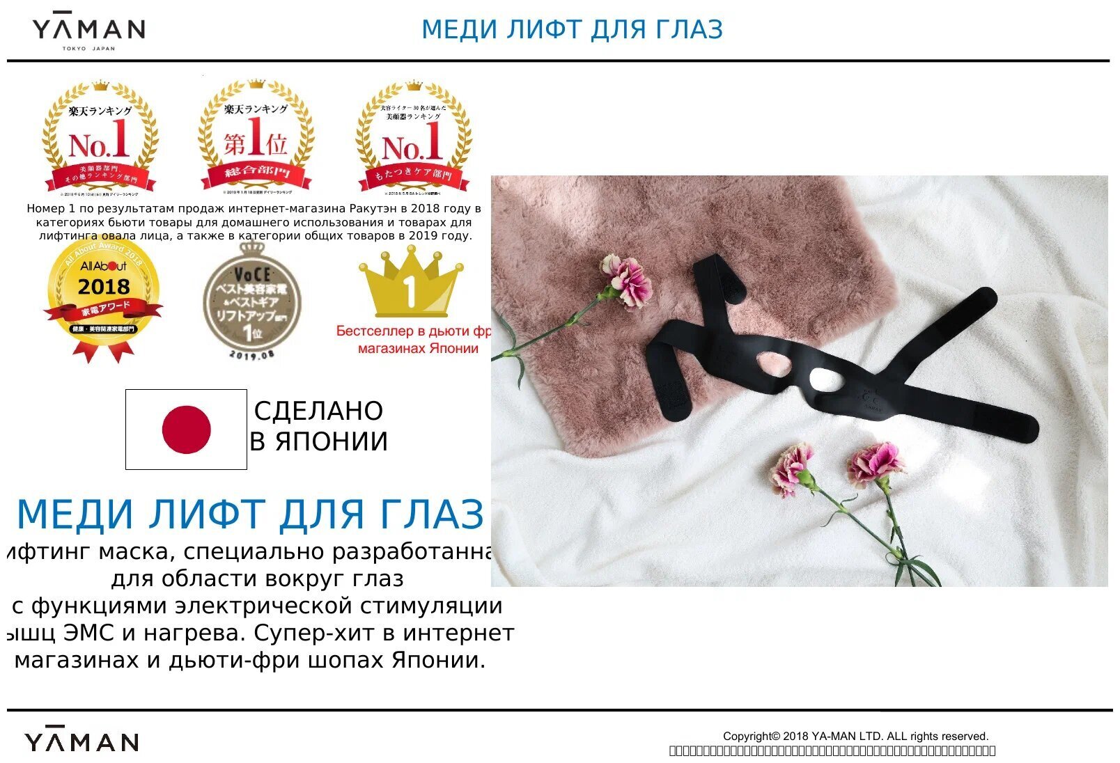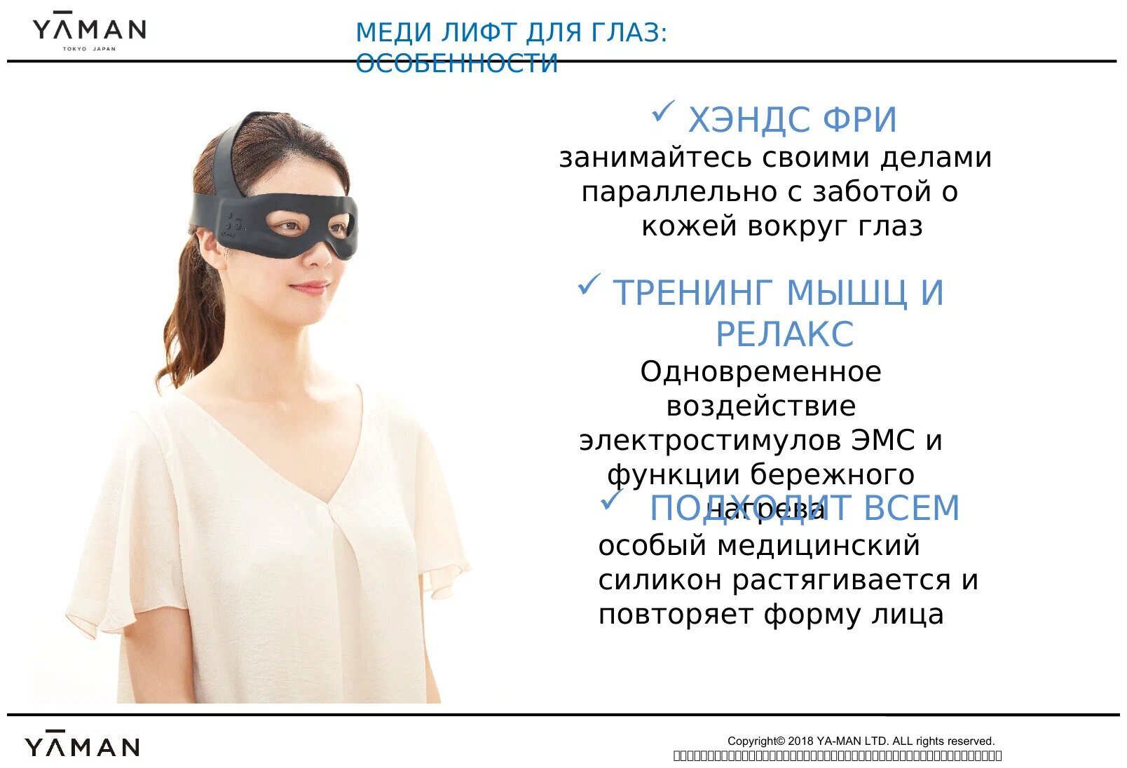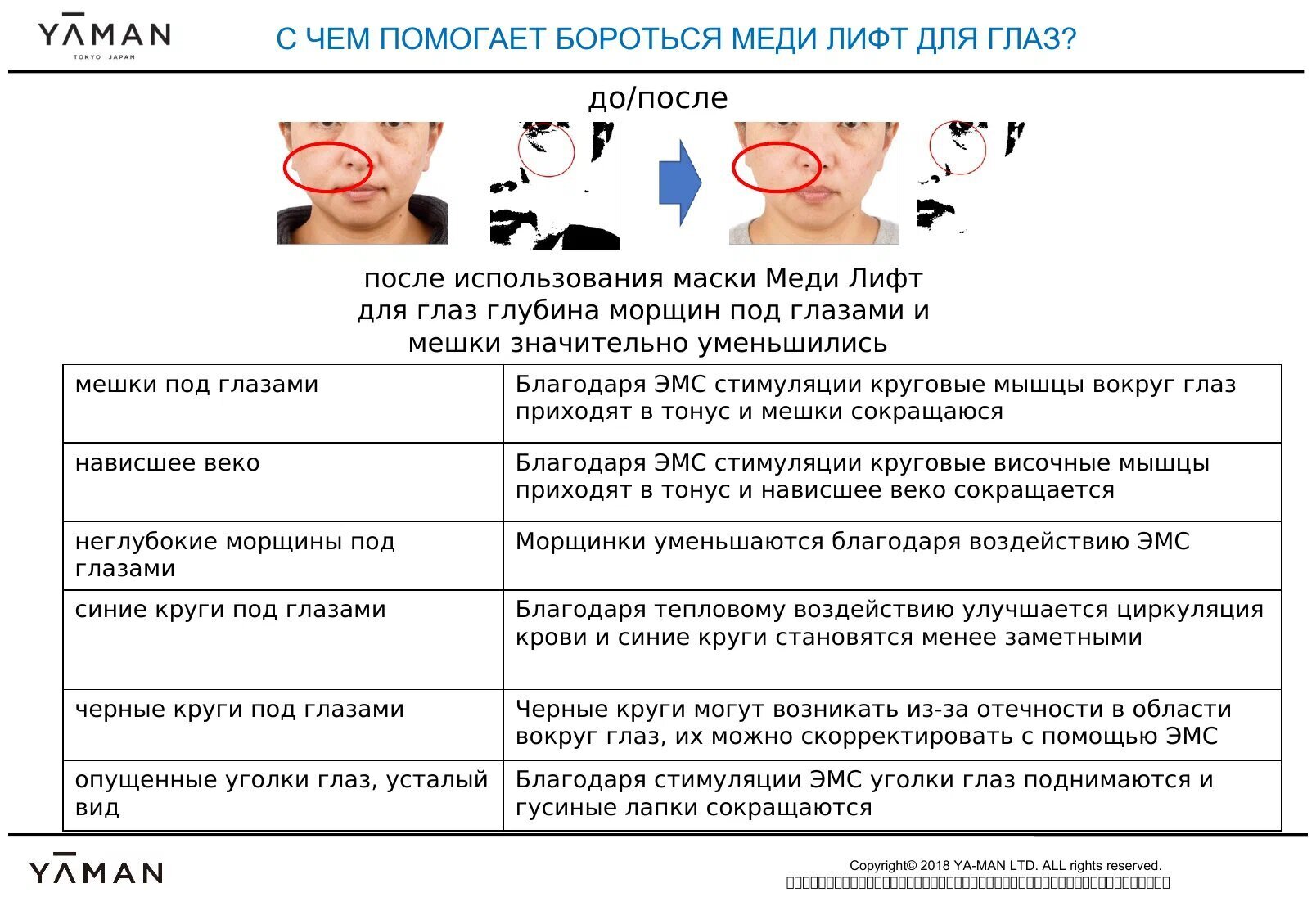 Электрический микротоковый массажер для лица YA-MAN Medi Lift Eye - это безопасный премиальный аппарат, который обеспечивает комплексное омоложение кожи вокруг глаз. Благодаря точечному воздействию EMS-токов на круговую мышцу глаз и височную мышцу, отёки уменьшаются, нормализуется лимфоток и кровообращение, что способствует омоложению кожи.